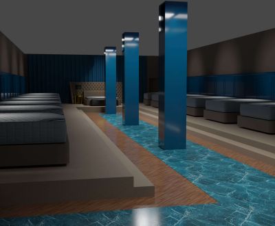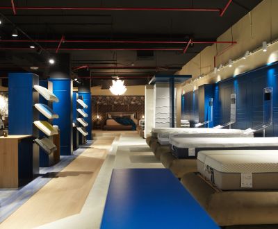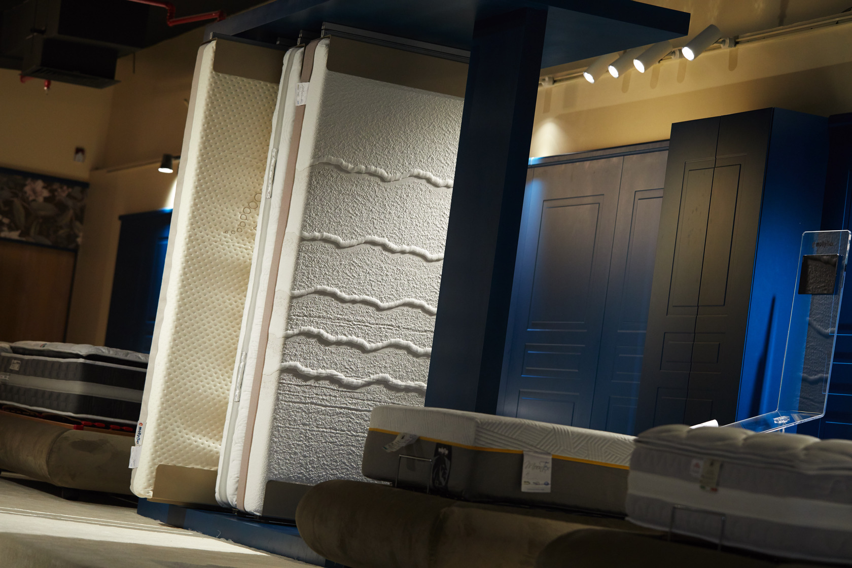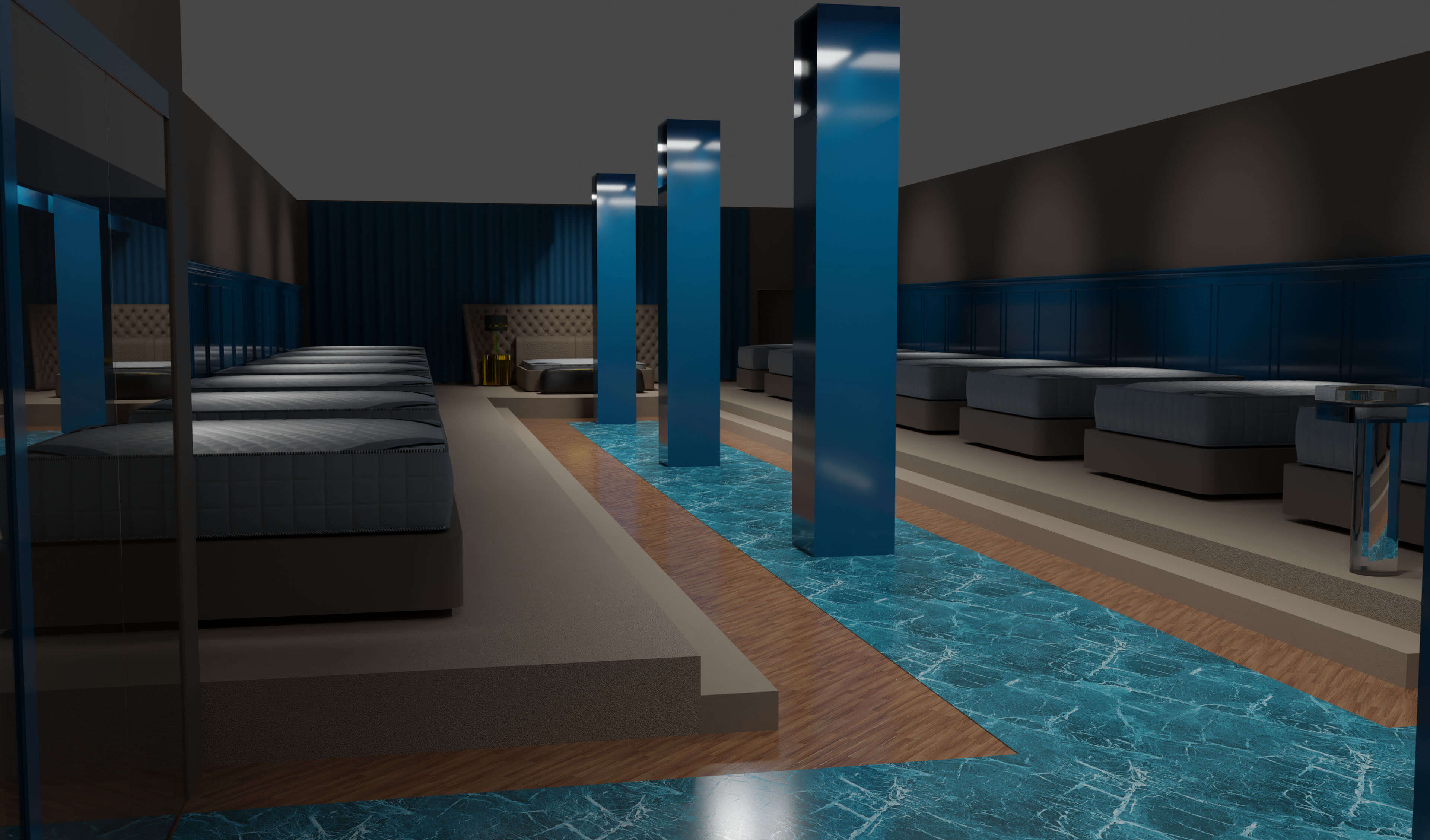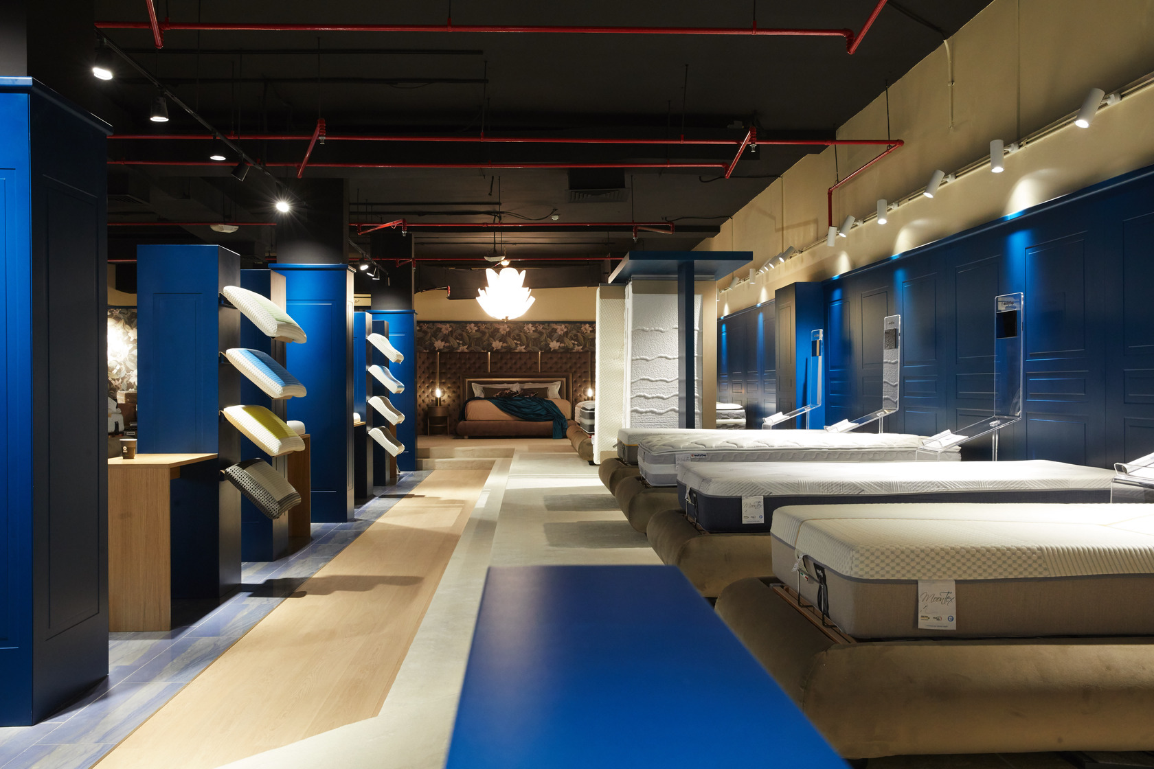 Lo spazio espositivo che abbiamo progettato per Mollyflex, è il risultato di un mix bilanciato tra raffinatezza italiana e opulenza emiratina: un ideale percorso nel mondo del riposo. “Abbiamo preso spunto dai colori della terra, e dai suoi elementi: la sabbia, l’acqua, e la creta, muovendoci in uno spettro cromatico che va dal marrone ai beige, passando per il blu, in tutte le loro molteplici sfumature. Il calore è dato delle boiserie che rivestono le pareti e dal pavimento in rovere naturale. La passerella in marmo Azul Macaubas, ammorbidisce il volume compatto del progetto, grazie alle sue venature. La durezza del marmo è contrapposta alla sinuosità dei suoi colori, la compattezza delle superfici lignee è in opposizione con la morbidezza dei velluti scelti per i rivestimenti, i somier nelle loro linee arrotondate vengono accarezzati dalla luce che ne delinea le forme e la tridimensionalità. La luce è la protagonista indiscussa del nostro teatro. La scelta di utilizzare luci puntiformi è dettata dalla volontà di guidare lo sguardo verso il prodotto enfatizzandone la texture con il controluce.