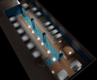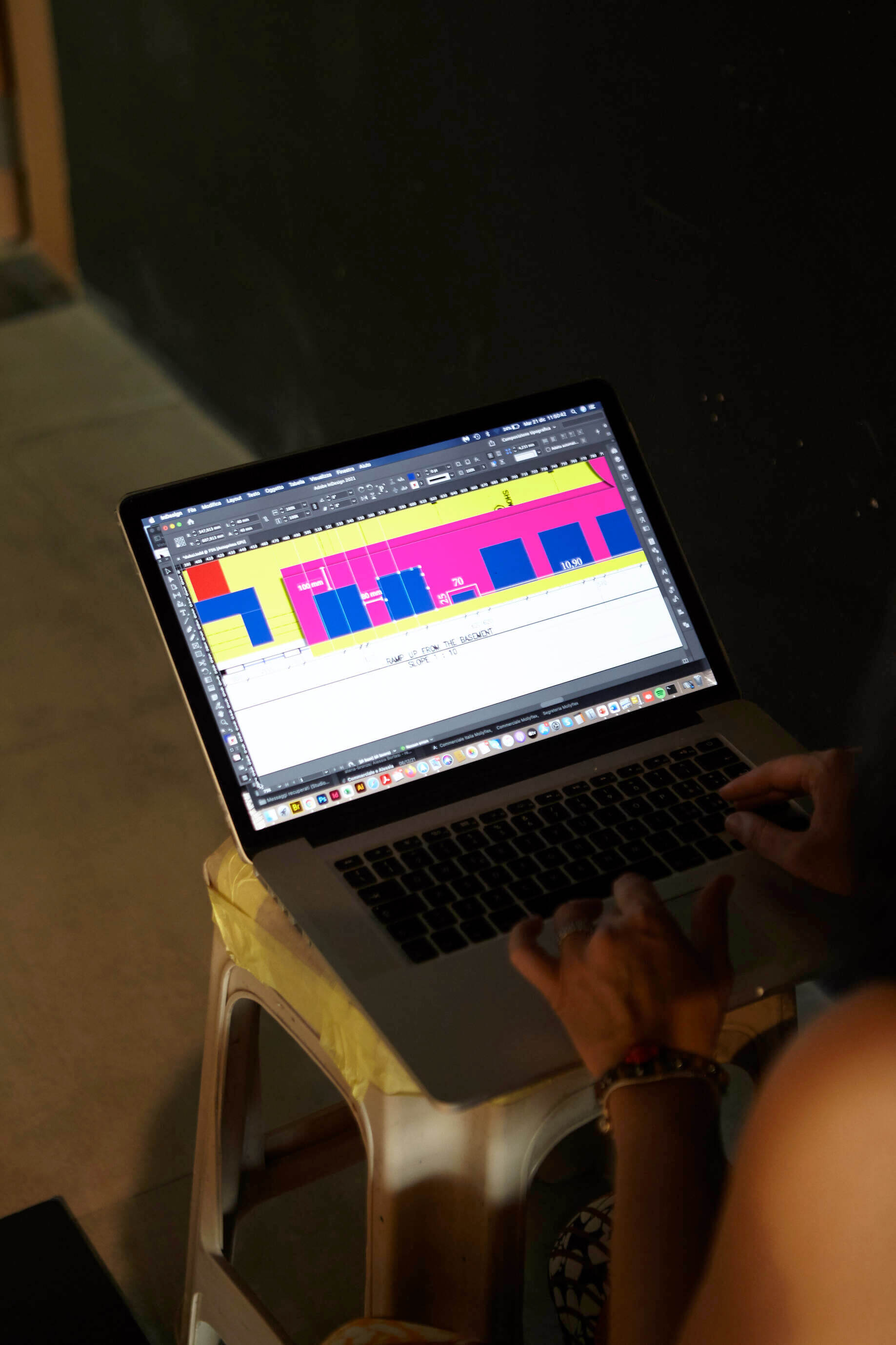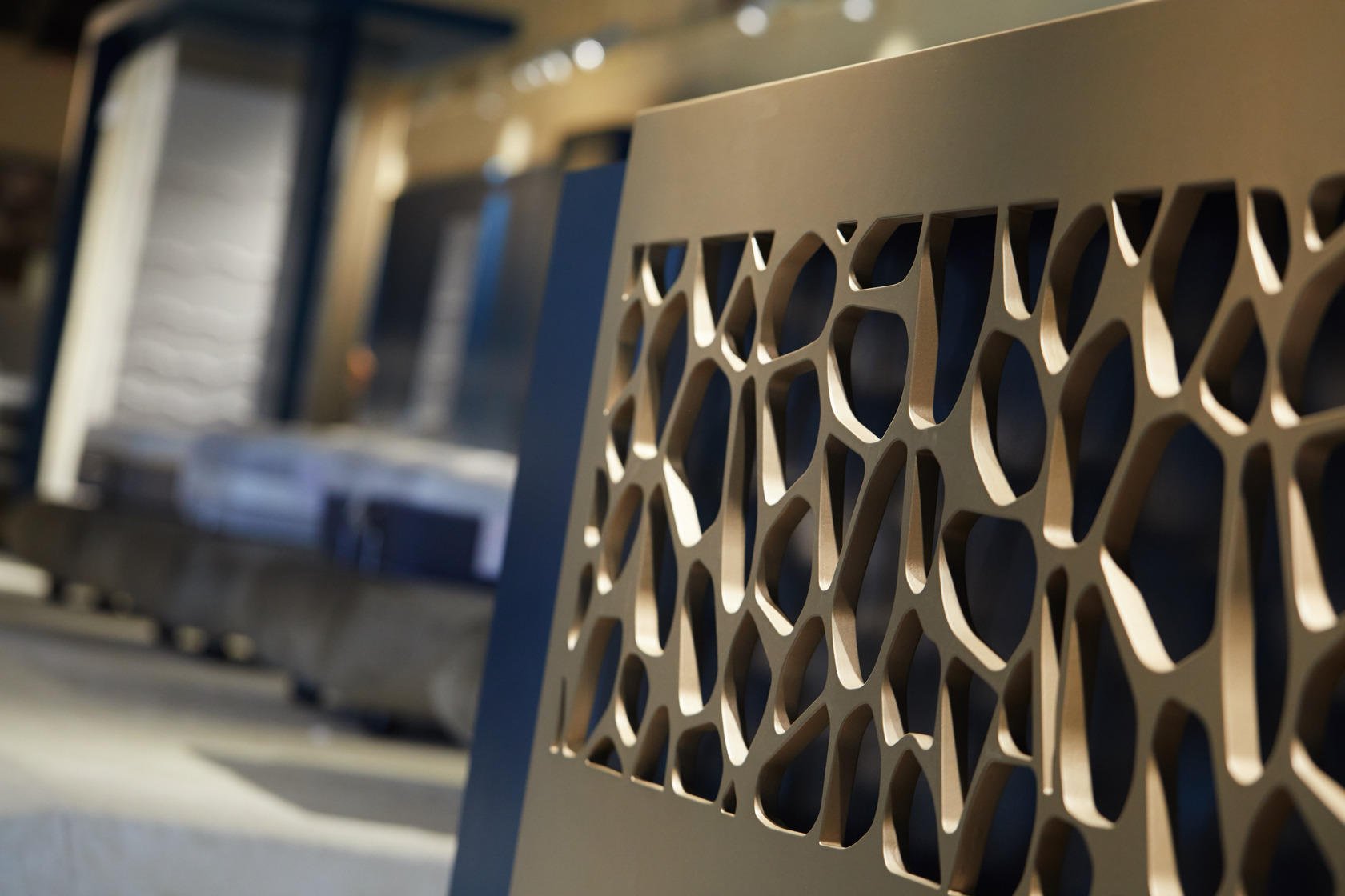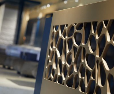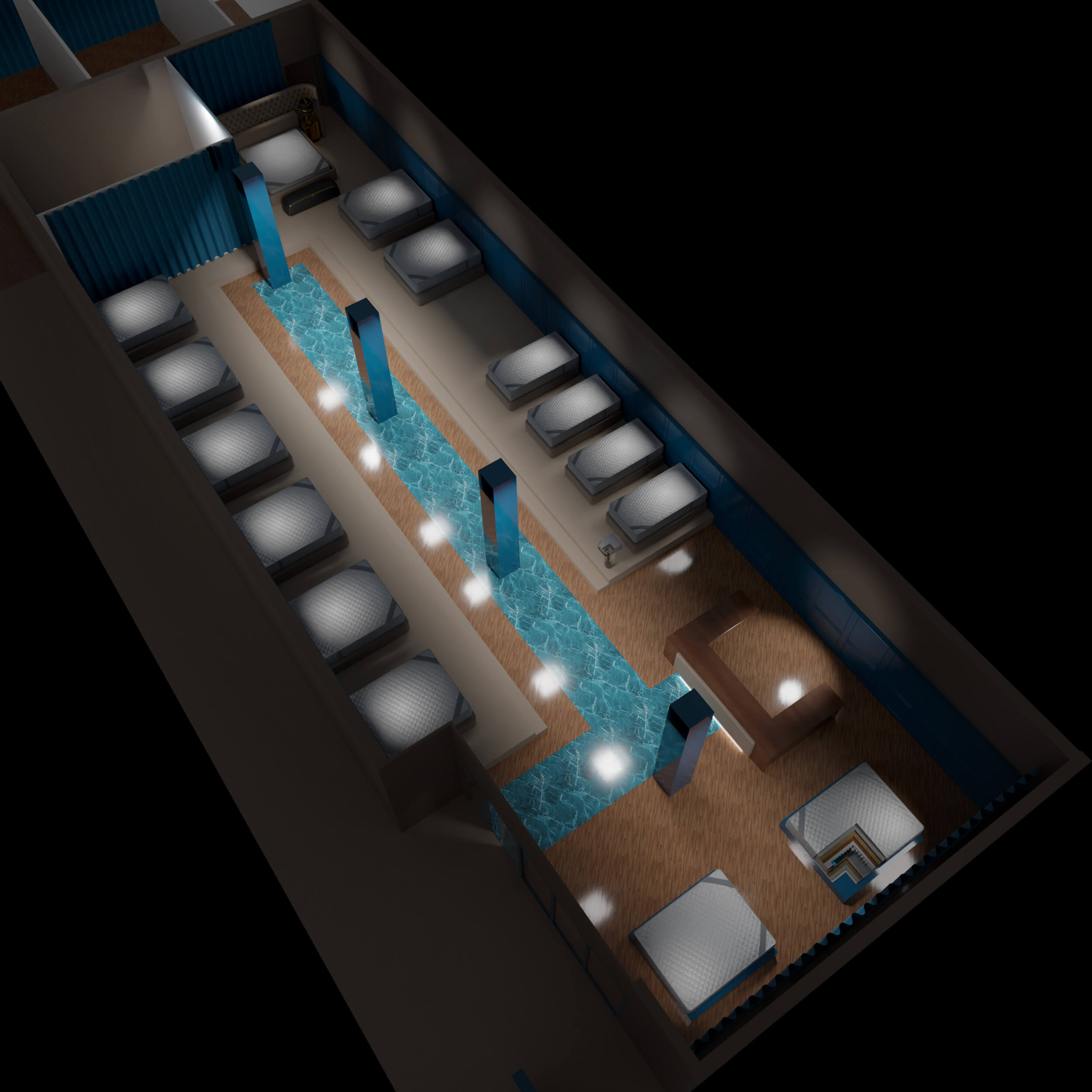 Lo spazio espositivo che abbiamo progettato per Mollyflex, è il risultato di un mix bilanciato tra raffinatezza italiana e opulenza emiratina: un ideale percorso nel mondo del riposo. “Abbiamo preso spunto dai colori della terra, e dai suoi elementi: la sabbia, l’acqua, e la creta, muovendoci in uno spettro cromatico che va dal marrone ai beige, passando per il blu, in tutte le loro molteplici sfumature. Il calore è dato delle boiserie che rivestono le pareti e dal pavimento in rovere naturale. La passerella in marmo Azul Macaubas, ammorbidisce il volume compatto del progetto, grazie alle sue venature. La durezza del marmo è contrapposta alla sinuosità dei suoi colori, la compattezza delle superfici lignee è in opposizione con la morbidezza dei velluti scelti per i rivestimenti, i somier nelle loro linee arrotondate vengono accarezzati dalla luce che ne delinea le forme e la tridimensionalità. La luce è la protagonista indiscussa del nostro teatro. La scelta di utilizzare luci puntiformi è dettata dalla volontà di guidare lo sguardo verso il prodotto enfatizzandone la texture con il controluce.