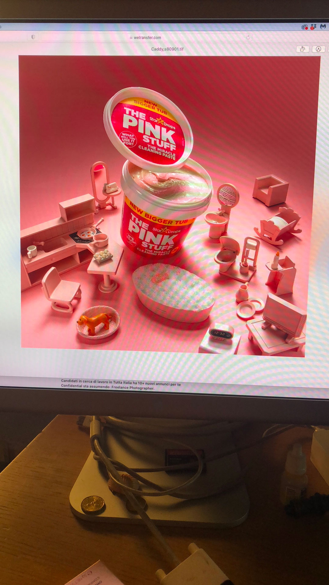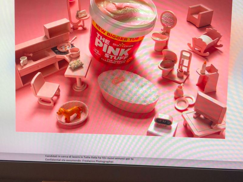 Se guardiamo al significato letterale del termine, Advertising richiama dall’inglese il verbo to advertise, che significa “avvertire”, “rendere noto”. Non è semplicemente fare una rappresentazione didascalica di un prodotto o un oggetto, è raccontarlo, nel suo aspetto, nel suo utilizzo, e quando possibilie fare leva su una sua peculiarità. Nel caso di Pink Stuff il fil rouge della campagna verte sul suo colore. È una pasta detergente definita “Miracolosa”, con la quale è possibile pulire “quasi tutto” e ha un colore meraviglioso è rosa bambola.