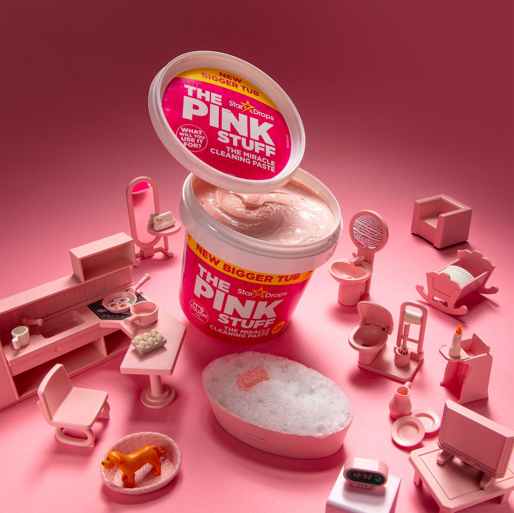 Quindi è rosa e sa BigBabol, e ci puoi pulire “quasi tutto”. Quindi in tempi non sospetti (prima dell’uscita del film Barbie) Vi presentiamo il mini mondo “rosa” di pink stuff: cucina, bagno, camera da letto, stoviglie e WC, tutto ma veramente tutto!!!